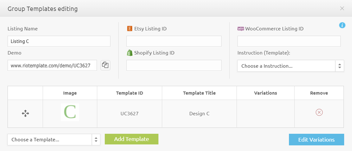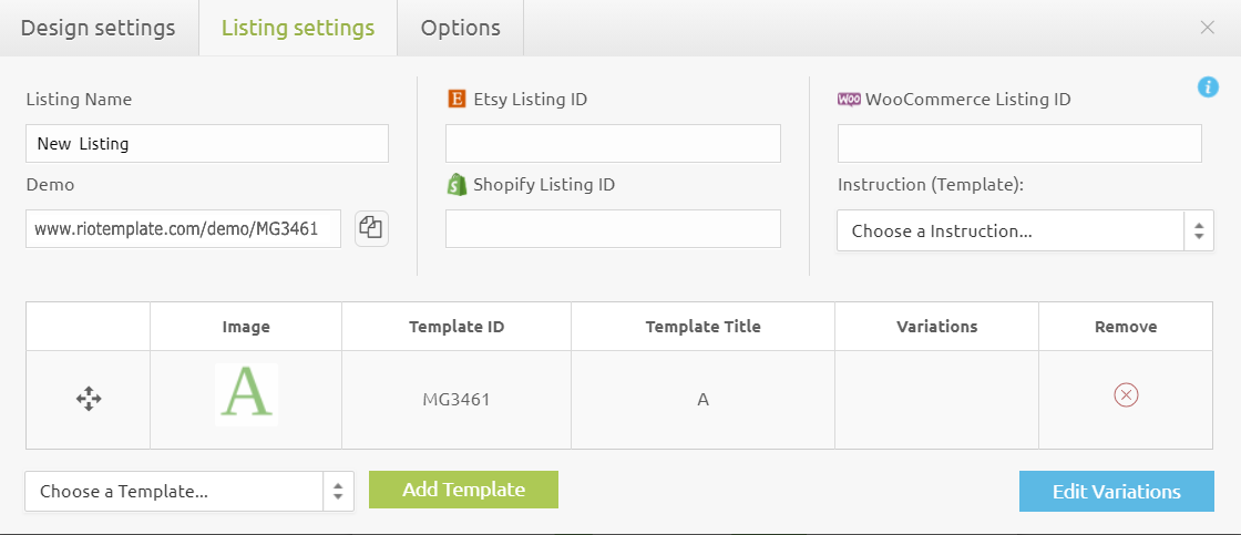 riotemplate Listings is a feature that makes it easier to organize and visually manage your designs by assigning them to listings in your riotemplate account that mirror the listings you have in your Etsy, WooCommerce, and/or Shopify stores. riotemplate Listings also make it possible to integrate with variations you may offer in your stores and offer specific designs based on the customer's variation selections at checkout.